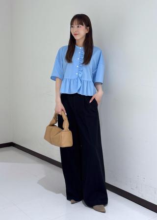 マニッシュな印象に仕上げた太めのワンタックのスラックスに、コルセットのようなラインや大胆な胸元のカッティングを施したブラトップを付けたアイテム。