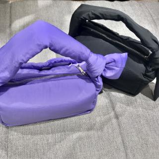 つい手に取りたくなるような、ふかふかの質感と発色の良さが魅力のワンハンドルバッグ。ハンドルの結び部分は取り外しができ、好みの長さに調節が可能。小さなバッグながらマチ幅が広く、長財布などの必要最低限の荷物はしっかりと入るこだわりのサイズ感も魅力。気軽にさっと使える、ナイロン素材の軽さも嬉しいポイント。