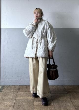 表地:スムース調のフェイクレザーと光沢のあるナイロン素材を組み合わせた異素材MIX。