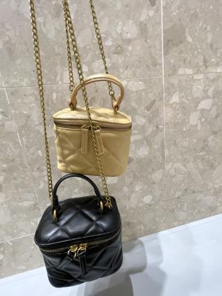今季の注目でもあるクラシカルなムードを取り入れた、キルティングのバニティーバッグ。深みのあるメッキ加工を施した金具で、ヴィンテージライクな雰囲気に仕上げているのが魅力。スタイリングのポイントにもしやすい、アクセサリー感覚で持てる小さなサイズ感もポイント。