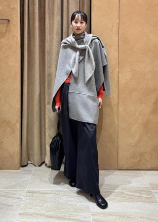 カシミヤ混で暖かいです。パッと羽織るだけでオシャレに仕上がります。羽織り方に決まりはないので、お好きな形で楽しんでいただけます。アウターの上に羽織っていただいても素敵ですよ。