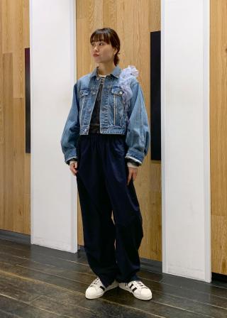 Gジャン×デニムパンツorチノパンのセットアップスタイルには、女性らしく華奢なヒールがおすすめ。ショートGジャンは、ボリュームスカートやリーンスカートなどともバランスの取りやすいアイテム。