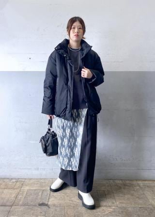 落ち感のあるパンツやタイトスカート、ワンピースの上にばさっと羽織るなど、ボトムを選ばない絶妙な丈感が優秀なダウン。