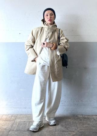 パリッと張りのある素材。コットン素材のボンディングでシワになりにくく形状も崩れないのが特徴です。オーバーサイズなのでインナーにも着込めるので体温調節しやすいです。