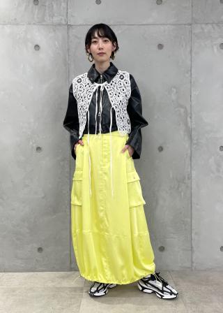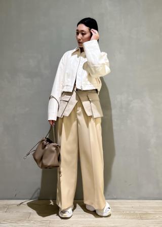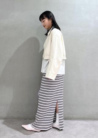 ショート丈なのでワイドパンツやボリュームのあるスカートと合わせるのがおすすめ。足元はフラットシューズやスニーカーなどで抜け感のあるスタイリングに。ワンピースの上からさっと羽織るのもぜひ。