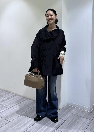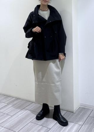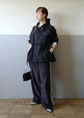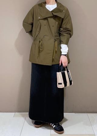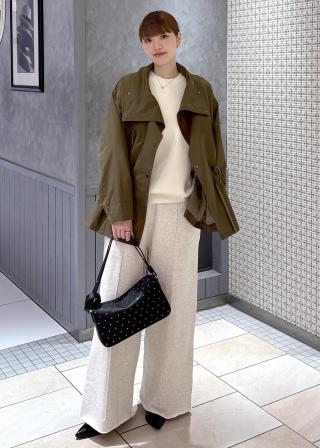 フロントのドットボタン開きやZIPファスナーポケットなどアクティブな印象と、たっぷりの分量を纏った女性らしいシルエットの1着。
