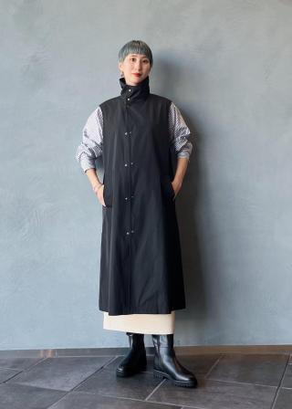 ジレ:高めのスタンドカラーに設定して顔まわりを華やかに仕上げた、大人っぽくきりっとした印象に仕上げたロング丈のジレ。シンプルなスタイリングに羽織るだけで、洗練されたスタイリングが完成するデザイン。
