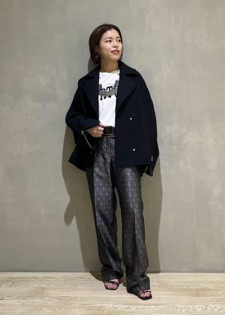 肩まわりがオーバーサイズで丸みを帯びたシルエットです。丸みを帯びたシルエットなので着られている感はなくバランスがとりやすいコートです。丈は165cmでヒップにかかるくらいでした。