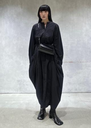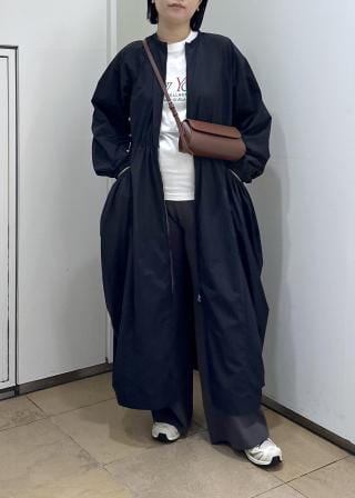 ファスナーを閉じ、コクーンワンピースとして着用したり、薄手のナイロンコートとしても。