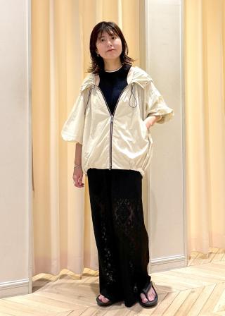 ボリュームのあるシルエットのため、ボトムはシンプルなスラックスやIラインワンピースなどの上にバサッと羽織るのがおすすめ。