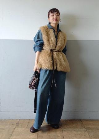 たっぷりの毛量を付属のレザーベルトでキュッと絞めて、より女性らしい雰囲気に。