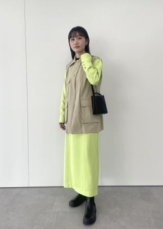 チノ素材でカジュアルな印象があるので、落ち感のあるワンピースやセットアップの上から羽織るコーディネートがおすすめ。パンツにも、スカートにも、着こなし次第で様々な変化を加えて楽しんで。