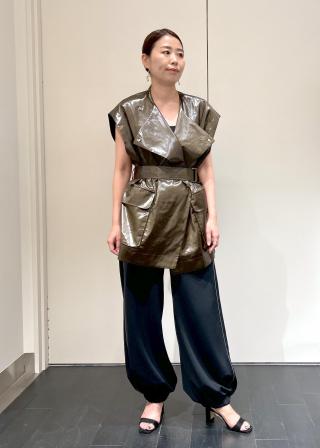 さっと羽織るだけで旬バランスに仕上がる、レザーのような風合いを楽しめるジレ。たっぷりとゆとりを持たせたボディと深いフロント合わせにすることで、ボタンを開けた際にドレープがより優美な雰囲気になるように仕上げたデザイン。きちんと見えつつも、大きめのフロントパッチポケットでカジュアルダウンさせているのもこだわりのポイント。共地ベルトは、生地で滑って抜けないよう孫ベルト仕様にしており、バックルで留めてもラフに結んでも楽しめる長さも魅力。