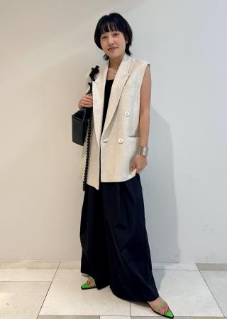 インナーはベアトップ等デコルテが見える女性らいいものがおすすめ。ミドルレングスパンツ(品番:GAS74040)とヒールパンプスでモードに。シンプルなIラインワンピを合わせたスタイルも相性◎