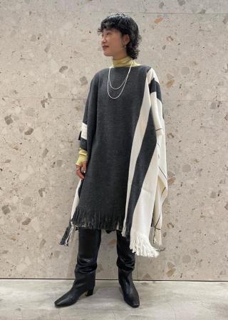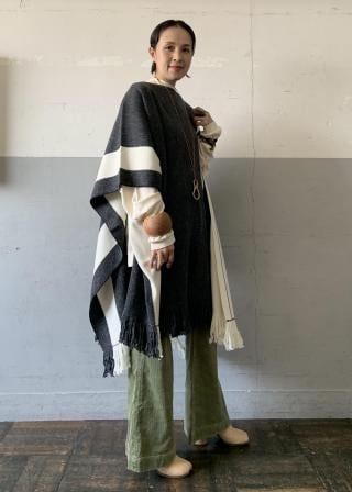 左右の配色バランスが違うBIGポンチョ。まるで織物のように見えるフリンジまで編み続きで仕上げた新しいニッティングが特徴です。プラスするだけでスタイリングが決まるインパクトあるアイテム。