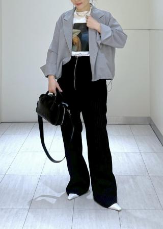裾を絞ればカジュアルに、絞らなければオフィスで使える万能ジャケット。白も可愛いですが、私はトップスの色味が透けて見えるのが気になってしまったのでライトグレーにしました。