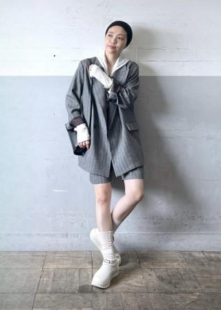 ダブルブレストとピークドラペルでマニッシュな雰囲気に仕上げたアイテム。