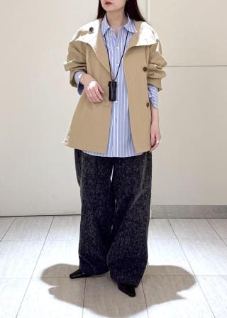 スタンドカラーで着ても、前を開けてリラックスな雰囲気にも、マニッシュにも女性らしくも叶う万能な一着。