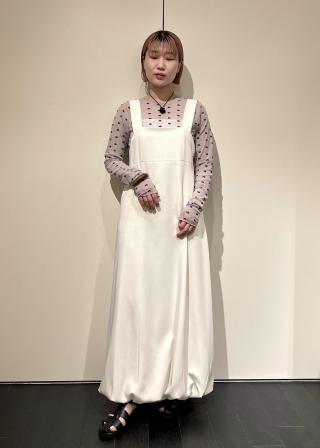 裾にタックとゴムギャザーを入れて裏地で吊る事でバルーンシルエットを作った、新鮮さを感じられるジャンパースカート。落ち感のある素材を使用することで、ボリュームが出すぎることなく、ふんわりとバルーンシルエットを楽しむことができる一着。太幅の肩紐を垂らしているのがアクセントとなっており、後ろのボタンで長さ調整できるのも嬉しいポイント。