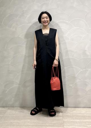 ワンピース:深いVネックがポイントの、程よいゆとりのあるリーンシルエットのロングワンピース。薄手の肩パッド入りで形崩れしにくく、オケージョンシーンなどでも活躍してくれる一着。
