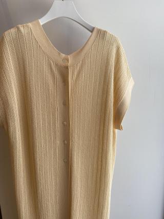細かく透かし柄編みされた前後2WAYのニットワンピース。中心を走る総針テープのディテールがあることで、全体が引き締まって見えるのが魅力。透かし柄編みなので、パンツやインナーとのレイヤードも楽しみやすいデザイン。ボタンを開け、ロングジレとしての着こなしができるのも魅力。
