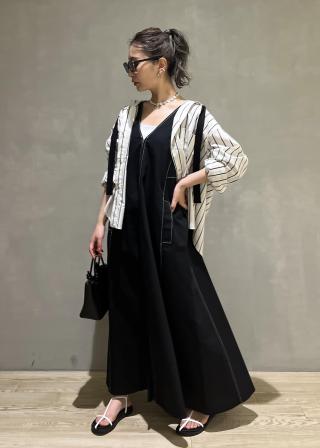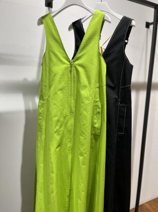 フロントのファスナーを閉めるとワンピースに、開けるとジレとしても着用出来る2WAYワンピース。スタイルアップして見えるようにウエスト切替にこだわっており、逆開ファスナーでスリット調整が可能なので、パンツとのスタイリングにも取り入れやすいデザイン。肩紐が調整できる仕様はもちろん、後ろに付いた大きなバックルがアクセントを加えてくれる一着。サイドの箱ポケットは、キャッチ—なデザインとしても、便利な実用面としても嬉しいポイント。