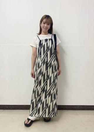 素材感とフロントのフリンジディテールが華やかなキャミワンピース。太いロープ紐や大きなハトメのデザインも魅力的。大人っぽいリーンシルエットで汎用性のある1枚。サイドにポケットがあったり、ロープ紐で肩紐の長さ調節が可能なのも嬉しいポイント。