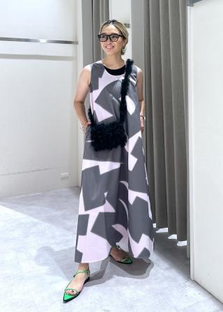 存在感のある総柄ワンピースは潔く一枚で。足元にはペタンコサンダルなどでリゾートなどにもおすすめ。