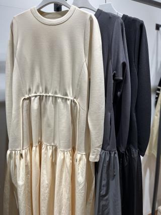 ジャージとタフタの異素材のコントラストが素敵なフレアワンピース。立体的な袖の膨らみやウエストディテールにこだわり、大人っぽく着用できるように仕上げたデザイン。ぷっくりとしたウエスト紐を付けており、好みのギャザー分量に調節できると共に、シルバーのコードエンドを付けることでデザインポイントに。切り替え位置を高めに設定することで叶うスタイルアップ効果や、サイドポケット付きという配慮も嬉しいポイント。