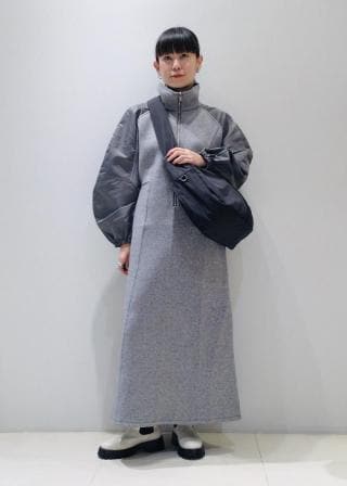 ダンボール素材とタフタのコンビワンピースです。ハーフジップが可愛い!タフタ素材のボリュームスリーブは意外と薄手。カットソーをレイヤードして袖を捲り上げて着ても可愛いです。とても楽ちんなシルエットですがウエストの内側に入ったらドローコードで絞れるので体型を選ばずに着ていただけそうです。