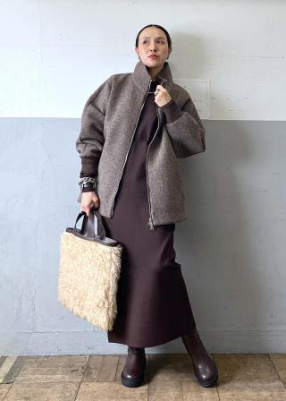 サイドのストッパーやバックジップ、全体に施された振りミシンなどがアクセントになっており、身幅から裾にかけてのタイトシルエットが、スタイルアップや着痩せ効果を叶えてくれる一着。