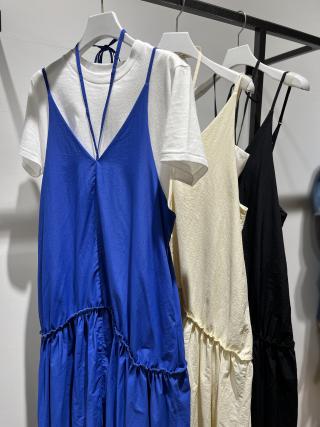 バストまわりをすっきりとさせつつ、切り替えから裾に向かって、たっぷりと入れたギャザーが女性らしいキャミソールワンピース。フロントのストラップは取り外し可能になっており、スタイリングに合わせて調整が可能。バックネックで結んだり、チョーカーのように首に巻いたりと、アレンジできるデザインが魅力。女性らしいシルエットをカジュアルな素材で仕上げることで、デイリーに着用しやすくしているのがこだわりのポイント。調節可能な肩紐や、サイドにポケットが付いた機能面も嬉しい一着。