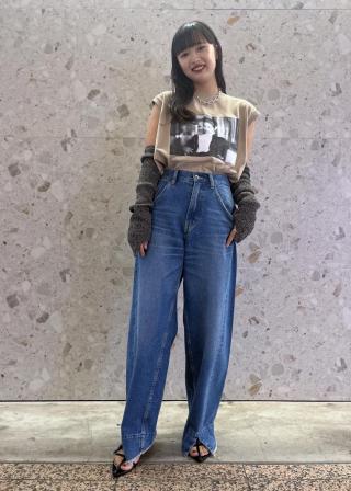 今っぽさを出すなら、腰履きでの着用や、短丈トップスとの合わせやコンパクトトップスをインしたY2Kコーデもおすすめ。肌寒い季節には、ブーツを合わせてスリットが開く足元のデザインポイントを楽しんでも素敵。ワイドストレートデニムとして、どんなトップスに合わせても好バランスなので、いろいろなバランスを楽しんで。