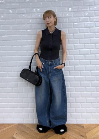 ウエストが少しゆったりめなサイズ感です。身幅は広めで、カーブのかかったシルエットがスタイリングのポイントとして使いやすいです◎