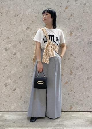 リラックス感のあるパンツなので、コンパクトなトップスを合わせるとメリハリのあるバランスに仕上がり好相性。スラックスのかっちり感を、フェミニンなトップスで甘さを加える雰囲気も素敵なのでぜひ。足元には、サンダルで抜け感を出すのがおすすめ。
