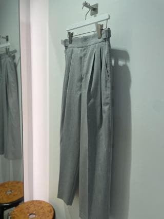 ウエストにサイドベルトがついており調節可能な仕様になっています。ゆったりシルエットのスラックスなのでコンパクトなトップスと合わせても◎