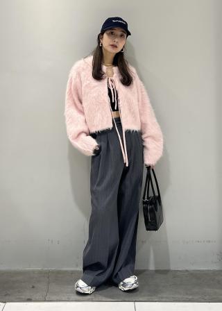 マニッシュな印象のスラックスには、フェミニンなレースジレにカシミアカーディガンを重ねたトップスを合わせたり、シンプルに梳毛カーディガン(品番:GAK25080)を合わせて同スカーフを胸に巻いたり腰に巻いたり。