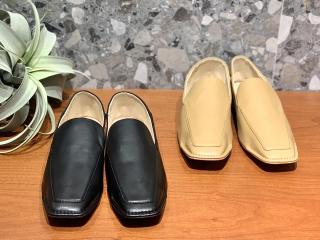 エッジの効いたデザインに格上げした、トゥ先のステッチワークがシンプルなローファー。かかとを倒して履けるバブーシュ仕様も魅力。