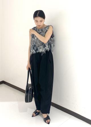 ルーズなシルエットのパンツの裾から履き口の変形のカッティングデザインをのぞかせるバランスも素敵。