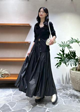 独特な素材を活かす、たっぷり分量を施したウエストゴムのイージースカート。揺れる度に眩しく光る、一着で存在感抜群なカラーとシルエット。
