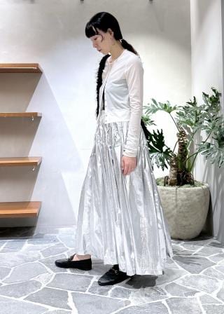 独特な素材を活かす、たっぷり分量を施したウエストゴムのイージースカート。揺れる度に眩しく光る、一着で存在感抜群なカラーとシルエット。