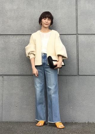 並んだパールがモード感たっぷりなデザインなので、ジャケットのようにさらっと羽織ったパンツスタイルがおすすめ。もちろん、デニムなどのカジュアルなボトムと合わせたスタイルもぜひ。