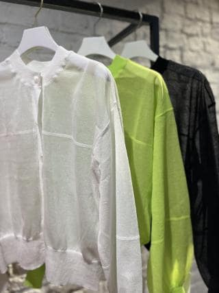 程よいシアー感でさらりとした素材感で清涼感のある1枚。カーディガンのように前開きで着るのはもちろん、バックボタン仕様でプルオーバーとしても着用可能な2way仕様。カットソーのような表振りステッチが抜け感を出してくれるポイント。夏には日差し避け・冷房対策にもおすすめ