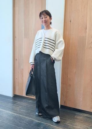 ボトムスを選ばない着丈なので、スリムなスラックスからフレアスカートまでお好みのバランス感に。上からコートも羽織やすい生地感なので、幅広いシーズンのスタイリングを楽しんで。