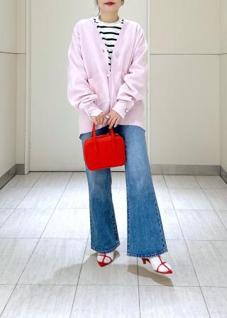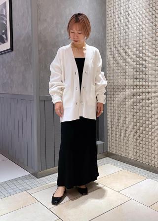 シルバーのボタンがアクセントになったカーディガンは胸元だけではなくお袖にも付いていてとても可愛いアイテム。着丈はお尻が隠れる長さでスラックスやデニム、スカート、ワンピースなど合わせやすいです。インナーにもスウェットを着て頂けるくらいのサイズ感なので、今の時期からアウターのインナーとして着ても◎