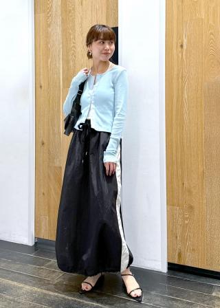 フロントのホックあきやホルターネックのドロストディティール、裾メローがフェミニンなカーディガン。短すぎない丈で、大人が取り入れやすいバランス。細身でヘルシーなシルエットがフェミニンムードをUP。
