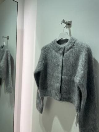毛足の長いシャギーがポイントのニットカーディガン。バランス良く見えるトレンドらしいコンパクトなサイズ感で、クリアボタンがスタイリングのアクセントに。