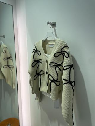シルエットにボリュームのあるリボンのようなデザインが可愛いカーディガンです!着丈が短くバランス良く着ていただけます◎