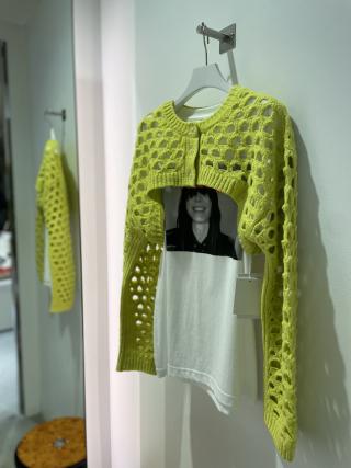 ふくらみのあるウール素材の糸でネット状のアイレットを入れた編地に仕上げ、透け感を楽しめる透かし編みニット。