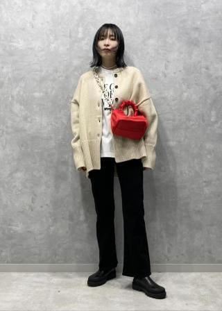 インナーにロゴTシャツなどを合わせればカジュアルに、ブラウスやワンピースに羽織ってきれいめにと、テイストを選ばずに着まわせる一着。カーディガンのゆるさを引き立てるなら、すっきりとしたパンツやリーンシルエットのスカートがおすすめ。ボタンを留めてプルオーバーとしての着用もぜひ。
